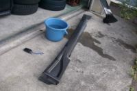 耐水ペーパーは水に強いただの紙ではなく水に強いサンドペーパーです。もっとわかりやすく言えば耐水紙ヤスリです。下地処理や塗装面を磨くために使います。なぜ耐水の必要があるのか?いいところに目をつけますねぇ。水をかけながら磨けば削った粉を洗い流し常にヤスリの目が綺麗な状態で磨けるんです。効率UP、磨き粉での余計な傷が付かなくてすむ等いいことづくし。水道代が気になる人はバケツに水入れてちょびちょびとやりましょう。川とかで汚染行為をしないように・・・(−−; シリコンオフは塗装面の油分を取り除きます。油汚れに〜ジョイ!・・・などで一生懸命洗ってやってもよいですがその作業を簡略化してくれます。油がついてると塗料をはじいて確実に失敗します。人間の手で塗装面にさわるのも×なのでゴム手袋などがあった方がいいかもしれませんね。ちなみにオラはそこまで神経質にはなれません・・・残念ながら(^.^; プライマーはバンパー用の物です。バンパーと塗料をがっちりくっつけてくれる仲人さんみたいなものです。塗料を塗る前に吹いときます。 塗りたい色の缶スプレー・・・まさか刷毛で塗るなんて考えてたんじゃ・・・・あんたは恐ろしい人じゃ・・・(−−;。欲しい本数が一つの店でそろわない場合がほとんどなのではしごしなきゃいけないかもしれません。純正色が欲しいなら車のどこかに番号が書いてあるはずなのでその色に合った番号の塗料を買いましょう。市販の缶スプレーが自分の色とぴったり合わない!なんて文句は言わないように・・・それは貴方の車が色あせてることがほとんどだったりして・・・(^.^;。どうしてもぴったりの色が欲しい!欲しい色が売ってない!っちゅー人は色を作ってくれるサービスをしてるところで買いましょう。最近はオートバックスやイエローハットなどでも手に入ります。でも基本的に高いですので今回必要な量を考えるとそこまでするくらいだったらオラなら素直に業者にだしますね。今回はサイドステップ用に5本、リヤウィング用に3本購入。しかも40がなくなったので3本は50で代用(^.^;もうはしごする元気もありません。じつはこれでも足りないくらいです。もう3〜4本欲しいところ。でも金が・・・ クリアースプレーは図画工作で言えばニスですよニス。仕上げに塗ったでしょう?厚塗りすれば透明な皮膜ができて艶もでて職人が仕上げたように見えるかもしれません。オラの場合は後々再塗装する可能性が大なのでその際の下地処理を簡略化するため艶が出る程度の薄さで塗ってます。 コンパウンドはあるといろいろ使えて便利です。磨き粉みたいなもんですが塗装後の仕上げなどにつかいます。粒子の大きさなどによって種類があります。今回はノーマル部品を取り外した後の汚れ落としにつかいました。しかも10年前にバイクの塗装に使ったときのあまりを使用・・・まだ普通に使えました(^^; 合計で1万はかるく超えました。業者さんが1万5千円で綺麗に塗ってくれるというのだったら業者に出した方がいいでしょう。ちなみに作業の三週間くらい前にはすでに買っておきました。野外で塗装する者にとって塗装のチャンスがきたらいつでも作業に取りかかれるくらいの準備は必要です。 作業: まず下地処理ということで耐水ペーパーで旧塗料をとります。耐水ペーパーも目の粗い奴から細かい奴へと使い分けていきましょう。新品を塗る場合も細かい奴で磨きましょう。傷を付けることによって塗料がはげにくくなります。つるつるの物はざらざらの物よりも持ちにくいのと同じ原理です(たぶん)。もちろんでっかい傷をつけちゃぁいけません。ちなみに旧塗料を全部とろうと思ったのですが飽きたので傷をつけるだけにします(−−;。たっぷりと水をかけながら磨くのがコツです。