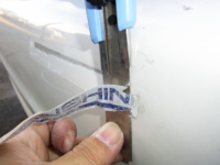 まずたまった泥汚れを洗い落とし、テープはカッターでそぎ落としました。