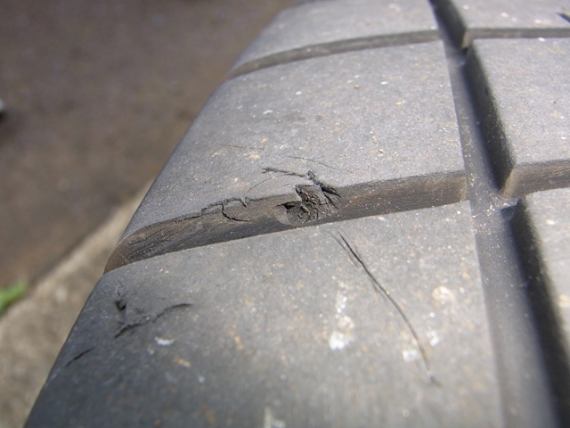 タイヤの傷。意外に丈夫なタイヤだったのか?バンパーはえぐっておきながらタイヤには寛大な障害物のようで
