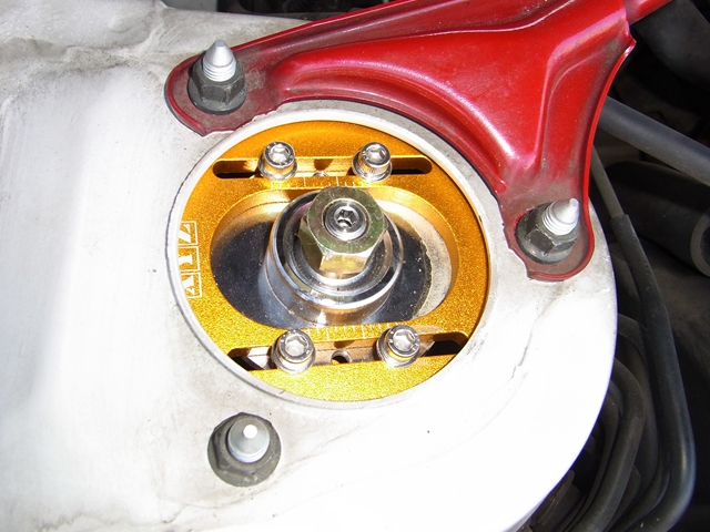 ボンネットをあけてピロアッパーのキャンバー角調整用の六角ネジを4本緩めます。