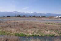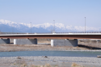 梓川の堤防から来たアルプスを望む 手前が梓川、奥が北アルプス 梓川に架かる橋とどこまでも続く北アルプス