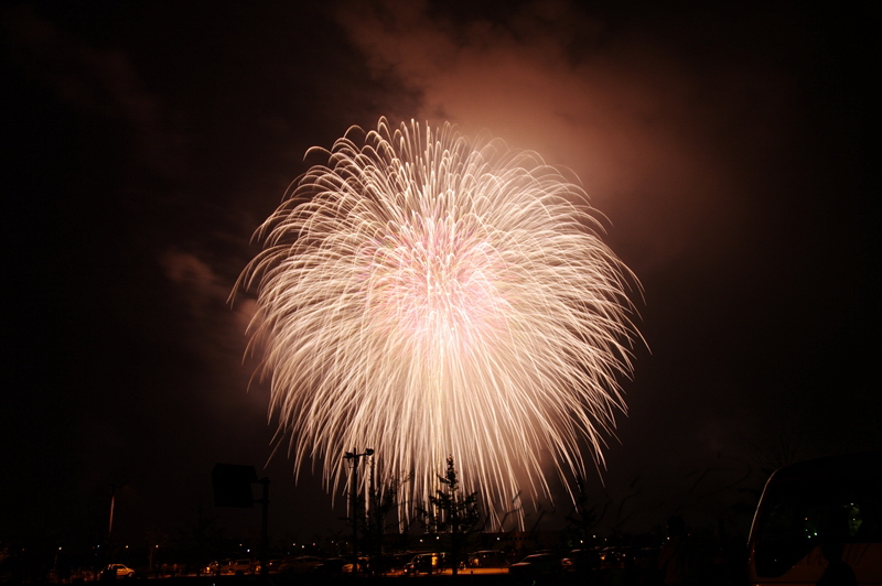 かなり離れているのでけっこう入ります 比較的近くで上がっている花火 かなり遠くで上がっている三尺玉。ナイアガラの煙が・・・
